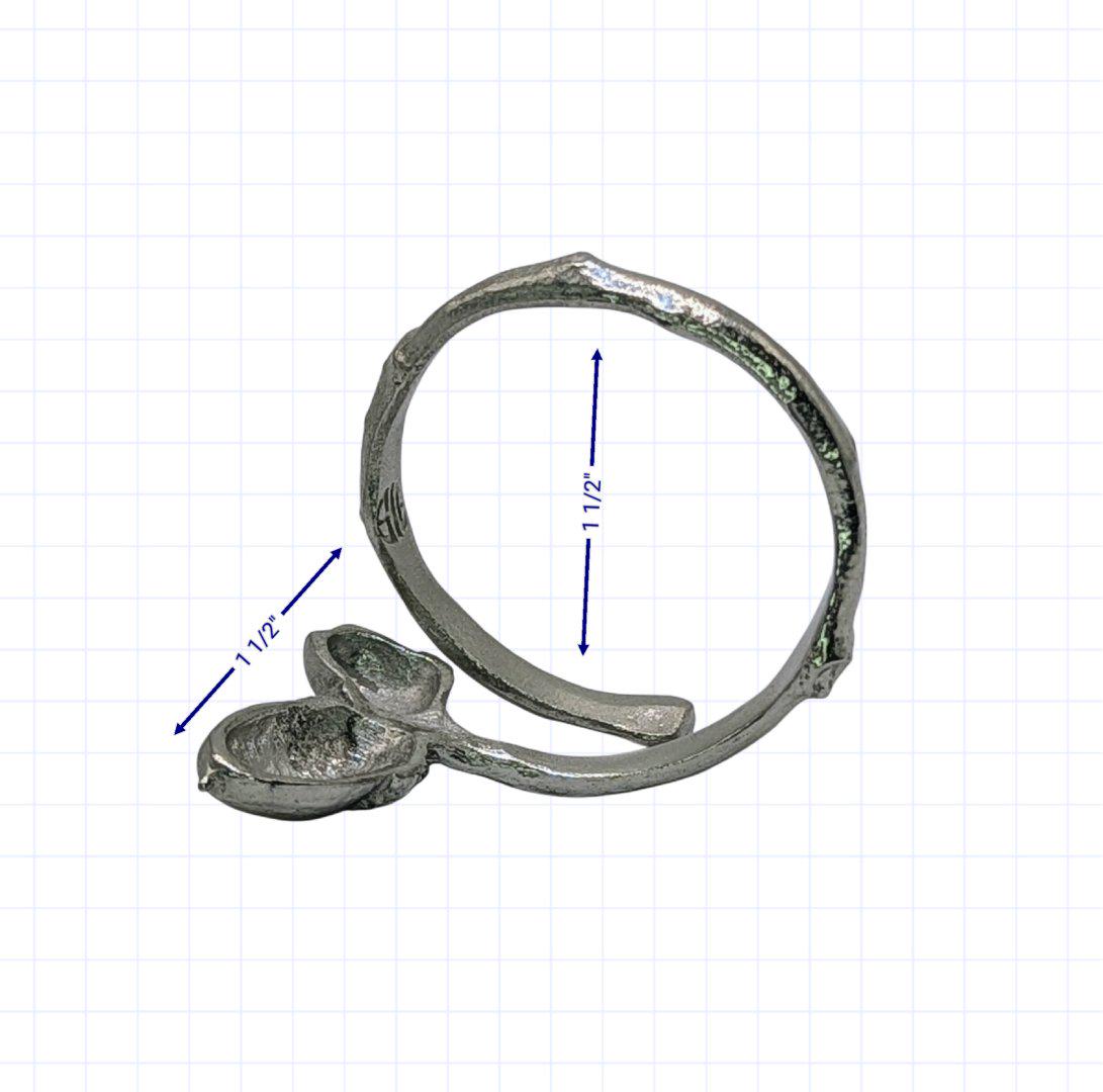 Add a touch of nature-inspired elegance to your table with this set of four pewter acorn napkin rings. Each ring is meticulously crafted with two acorns, showcasing the intricate details of their caps and nuts, resting on a realistically textured twig band. The open design of the ring allows for easy placement and removal of napkins. Perfect for seasonal gatherings, holiday feasts, or everyday dining.