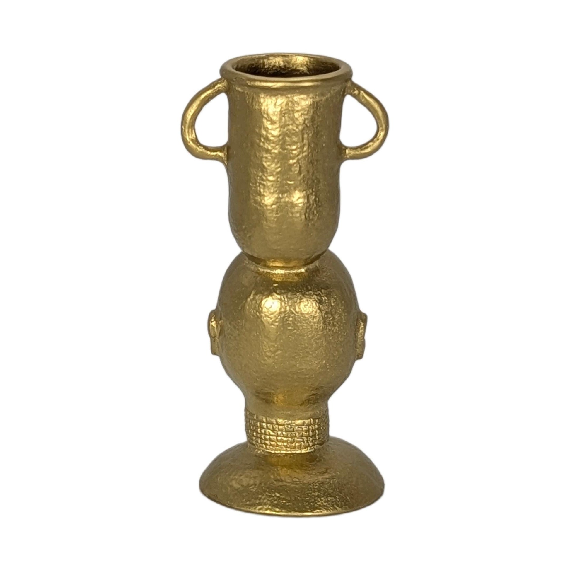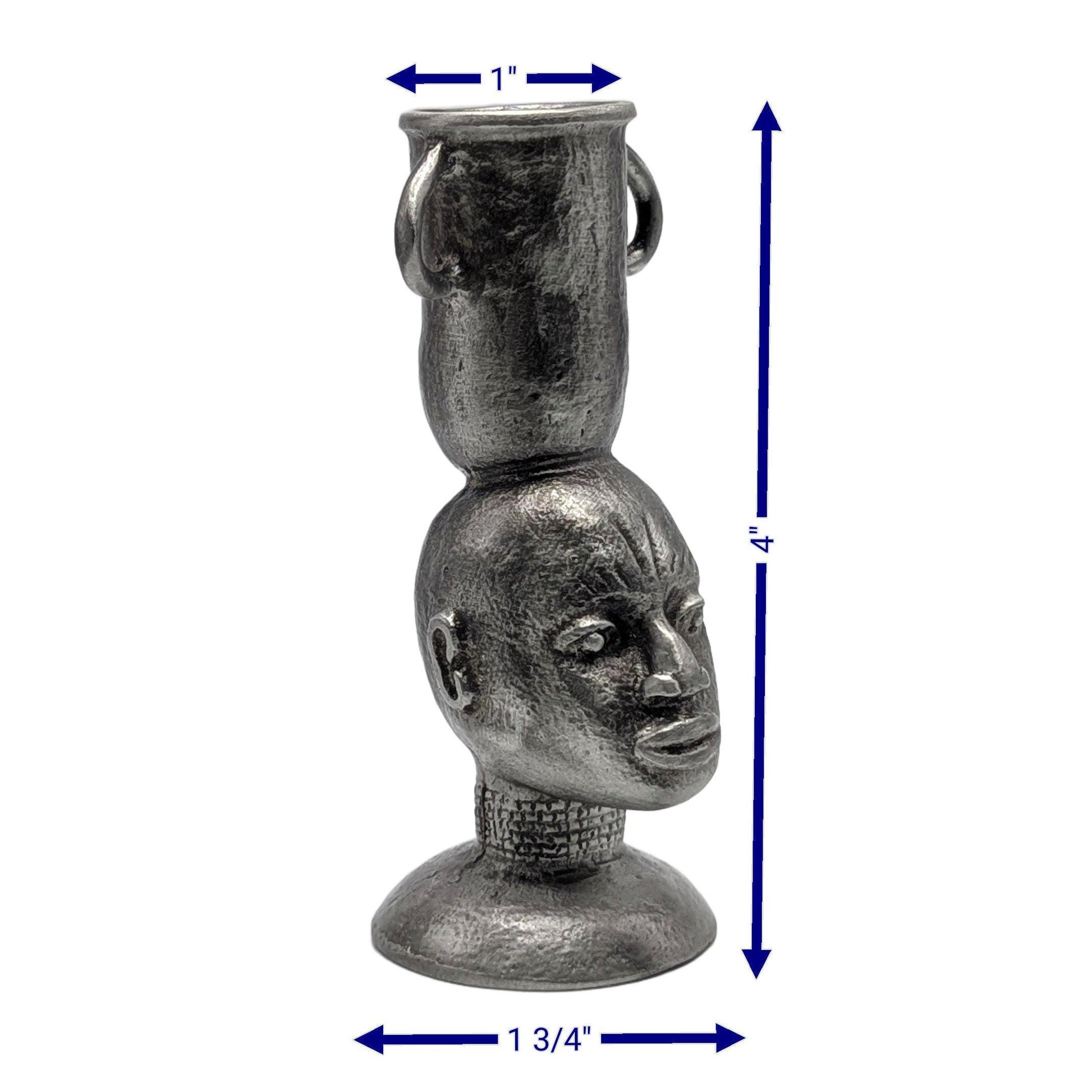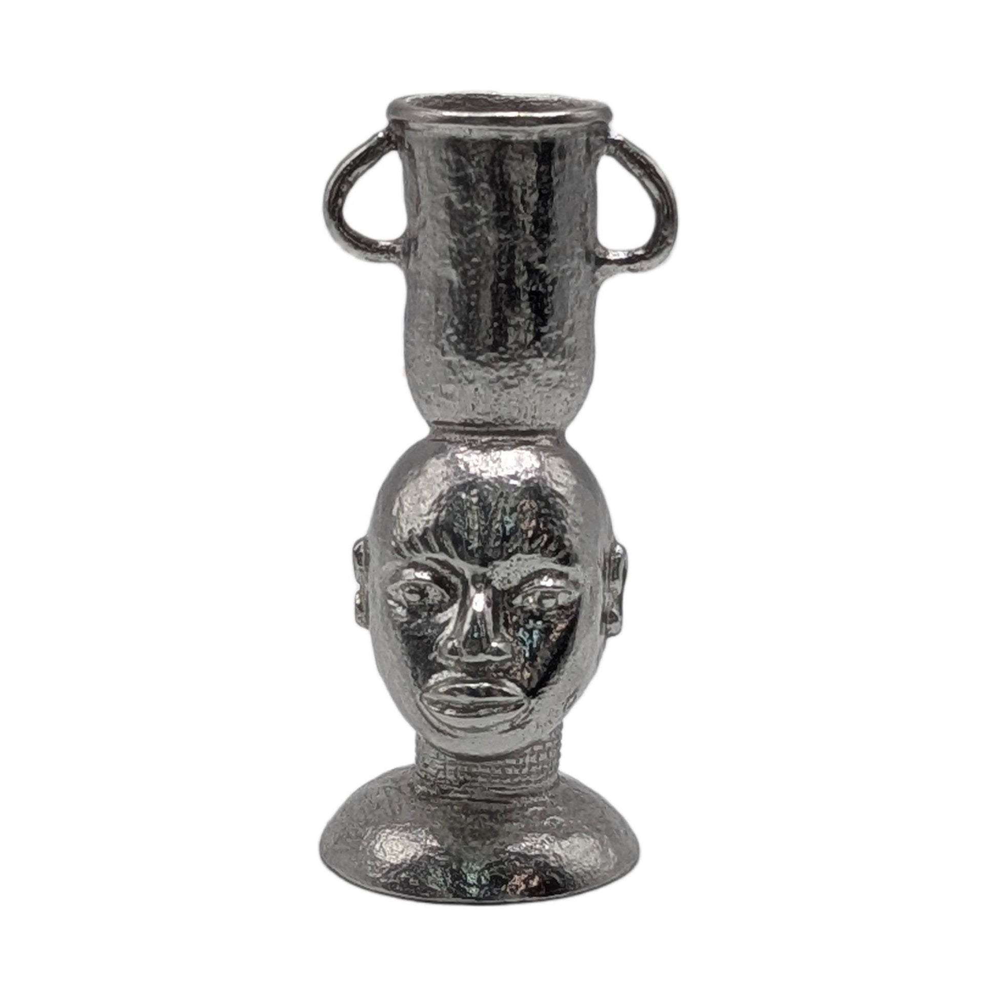 This striking candle holder features a finely detailed bust, reminiscent of classic African sculptures, crowned with an elegant, two-handled vessel designed to perfectly cradle your favorite taper candle. The pewter material is given a deliberately rustic finish, highlighting its natural imperfections and providing a wonderfully tactile, aged appearance. Its weighty feel speaks to its quality and ensures stability wherever you choose to display it.