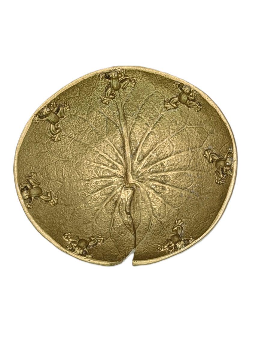Elevate your home decor with our stunning Waterlily Bowl. This beautiful bowl features a waterlily leaf cast in relief with moving frogs at the edge, creating a beautiful and unique design. Crafted from high-quality metal alloy, this bowl is not only visually appealing but also durable and long-lasting. Perfect for holding trinkets, jewelry, or simply as a standalone decorative piece, the Waterlily Bowl adds a touch of elegance to any space. Whether you're looking for a special gift or a statement piece for your own home, this bowl is sure to impress. Shop now at our gift shop and bring a touch of nature-inspired sophistication to your surroundings.